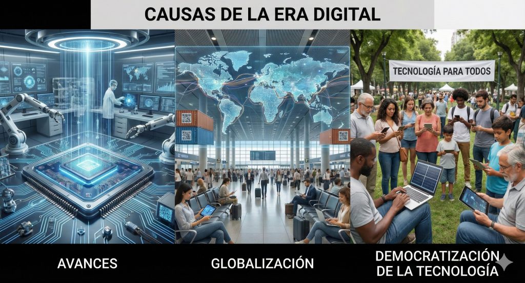- Avances Tecnológicos: El rápido desarrollo de tecnologías como la informática, internet, la inteligencia artificial y el internet de las cosas (IoT) ha impulsado la era digital.